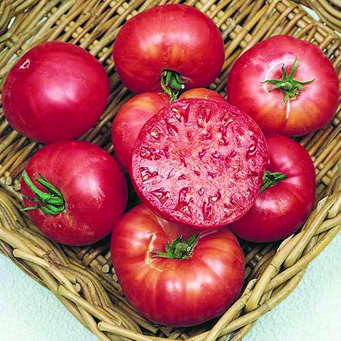The story of this tomato starts in the 30's when the owner of a radiator shop was facing bankruptcy. Even though he was not a plant breeder, he tried breeding 4 varieties of tomatoes together and came up with this large, pink- skinned, tasty and meaty tomato. He sold 1,000 plants of this tomato for $1 each and was able to pay off the mortgage with the proceeds. Fruits average 2 lbs and have very few seeds.